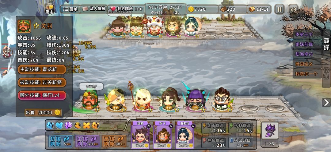 过关关键是关羽5星刷技能,红色必备优先加伤害(前提是cd满了,cd没满优先减cd)如果神技有加暴击率,近战暴击率,可以选爆伤,如果暴击率为0就加技能伤害