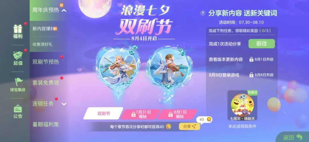 周年庆特别活动之一的双刷节就要开始了,孤寡菲菲子含泪给球宝们带来新爆料。今年的双刷节将在8月4日正式开启,这一天还是浪漫的七夕节哦,双节合一甜蜜加倍。