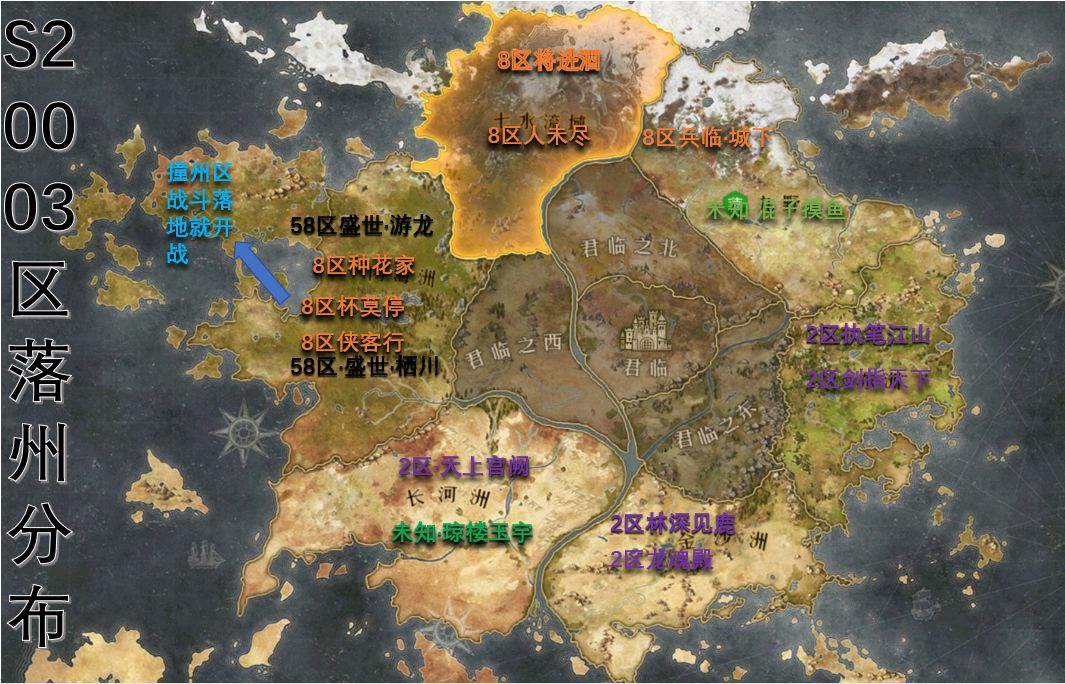 君北【雪中行】、【将进酒】双盟进入资源州,和S2赛季背道而驰的【兵临盟】交战,打得【兵临】节节败退,成功阻断其进入君临之路。后2区君东【江上呤】破关来援【兵临盟】,也被【秦魂】君北双盟打退!