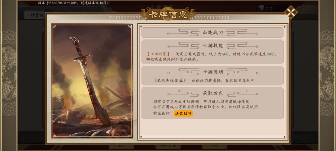 1.首先就是石亨的血洗战刀这张卡比较适合开局走六扇门和东厂,对刀类功法武器有修炼速度加成,而且还带有被动效果流血攻击敌人后每回合损失当前气血的2%(ps:流血效果所有功法都可触发,不止刀类功法)而且使用刀类武器攻击增加不是固定100,实测会随着你的攻击会逐步增加的综合评价:T1 玩刀法门派可以带 前中后期都有加成