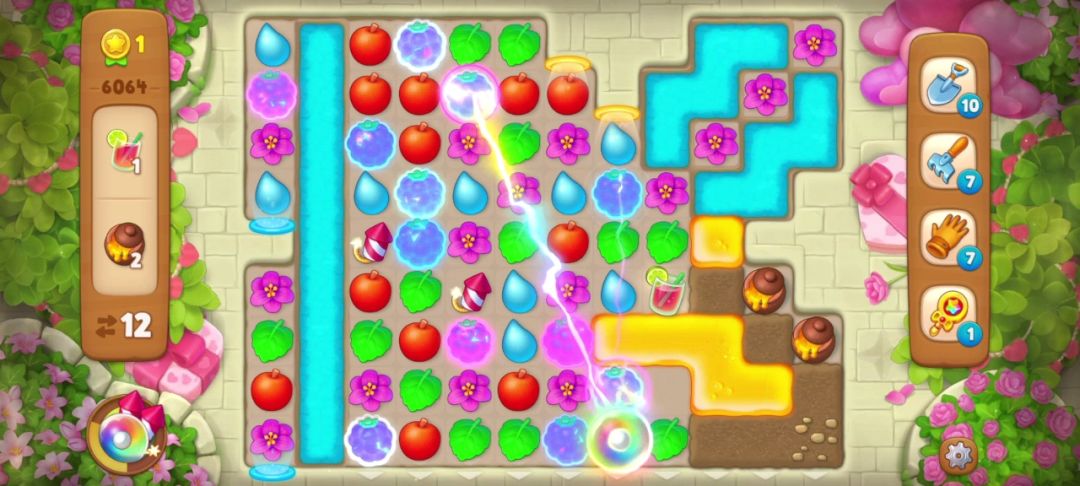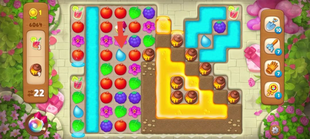 过了5步我发现能量攒的很慢,蜂蜜旁没有元素可匹配,我就用彩虹球匹配葡萄清除一个蜂蜜防止它继续扩散👇