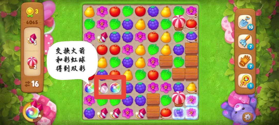 花了三步得到第二个彩虹球(我获得了加两步道具),运气好这个位置可以凑双彩,我先匹配梨得到火箭,然后交换火箭和彩虹球就凑到了双彩👇👇👇