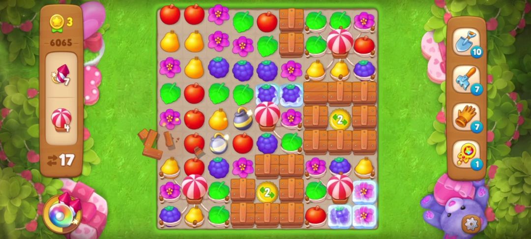 👆上图交换苹果和花朵,可以让花朵形成一个可制造炸/弹的形状,没想到运气好交换花朵和葡萄可以得到两个炸/弹👇