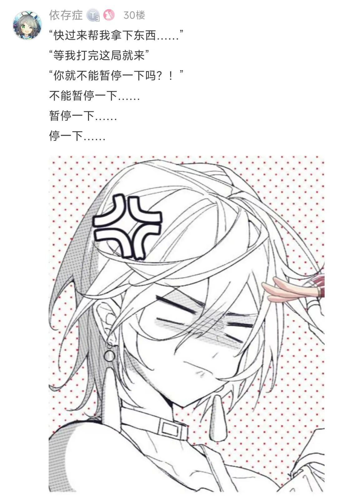 其实“你就不能暂停一下吗?”这个问题的关键,并不是你玩的游戏能不能暂停,而是价值观的不同。在玩家的眼中,不能“暂停”的原因也许是一场关键的定级赛,也许是剧情正要发展到高潮,也许是正在和工会的兄弟们打副本的最后一个BOSS。但是在问出这个问题的人来看,ta觉得游戏只是可有可无的娱乐,吃饭也好、帮忙拿东西也好,都是比打游戏重要得多的事情。如果这个世界能多一些理解和尊重的话,该有多和谐。