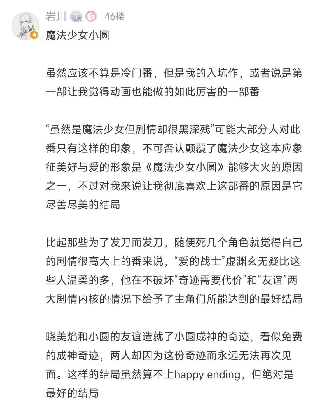 甚至可以说是拔高了魔法少女这个题材上限的一部作品,确实经典。