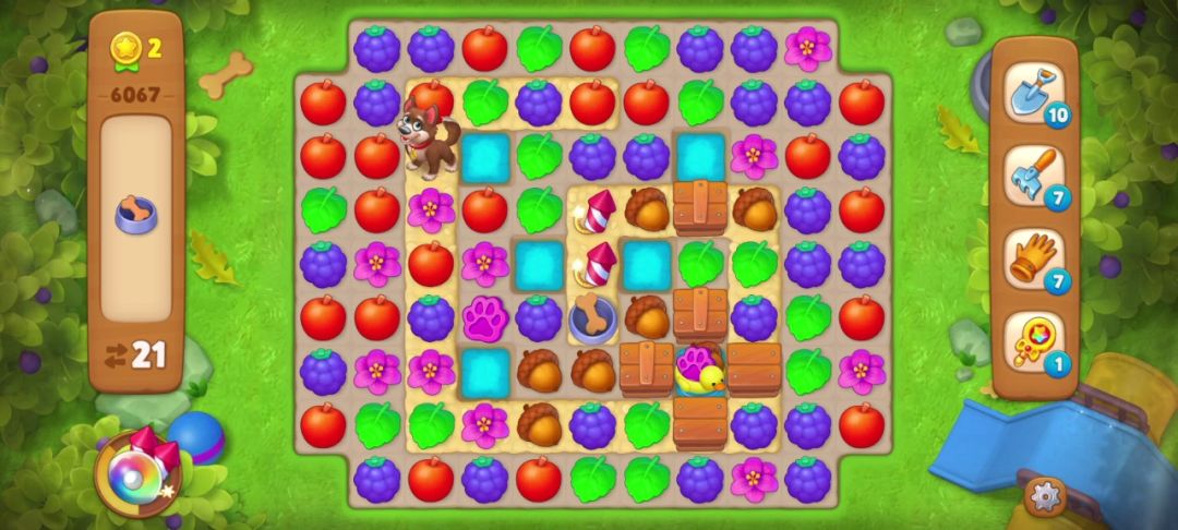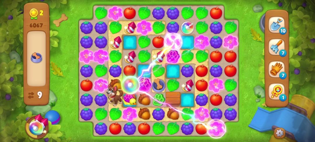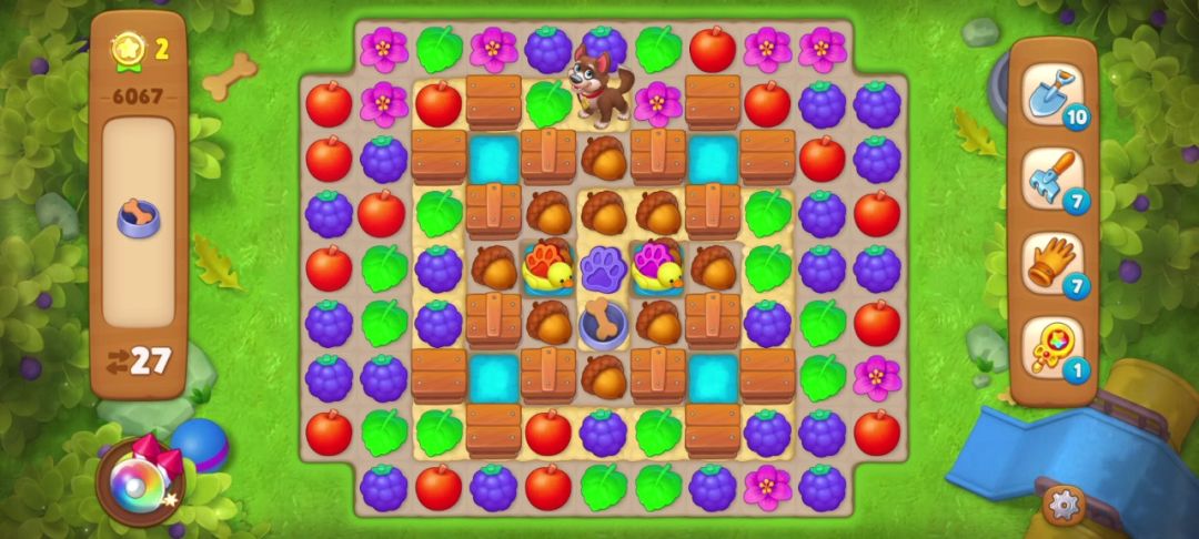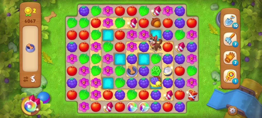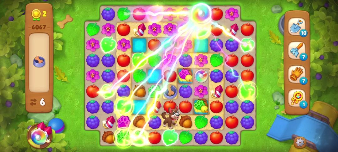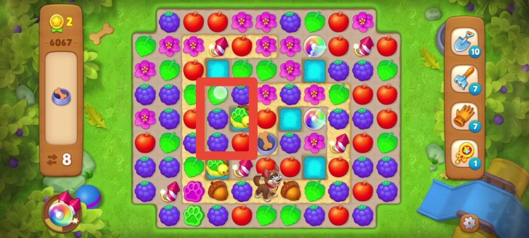 然后用道具制造连锁爆炸又得到一个彩虹球,我先匹配葡萄释放出两个狗爪饼干,然后用彩虹球匹配树叶收集狗爪饼干!👇👇