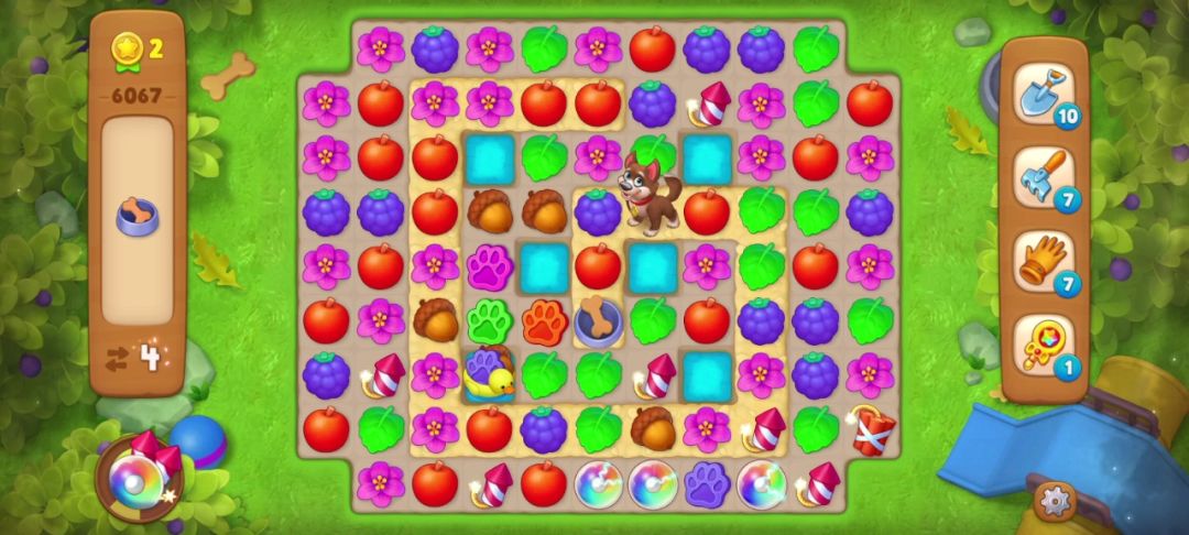 用了4步得到第二个彩虹球,位置不好,不能凑双彩,步数对于达成目标来说不算多,我就用彩虹球和花朵匹配,既能释放橡皮鸭里的狗爪饼干,还能收集到两个狗爪饼干!👇👇