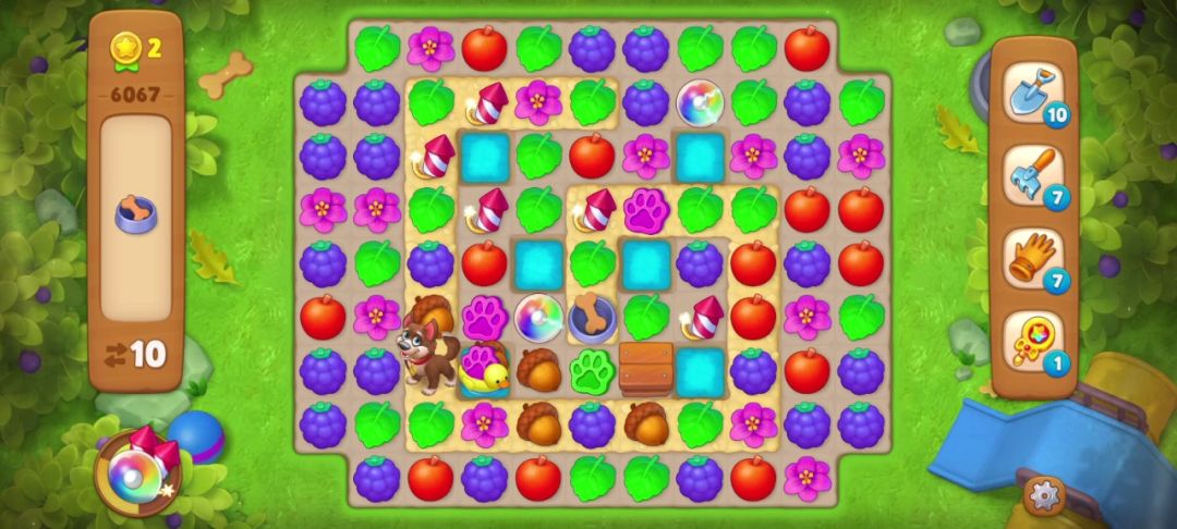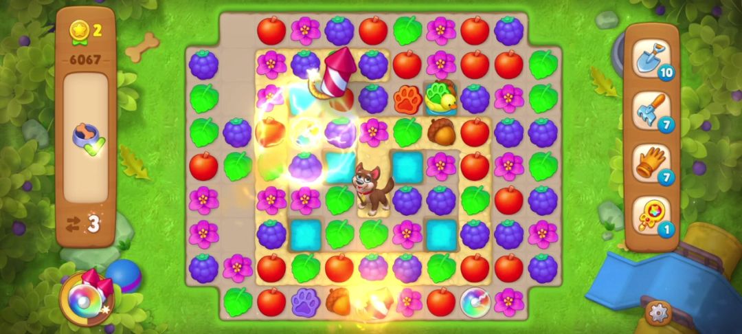 👆注意此时狗爪饼干只有1个,而狗狗前进需要4个狗爪饼干,所以我能释放出足够的狗爪饼干再用双彩全屏清除!👇