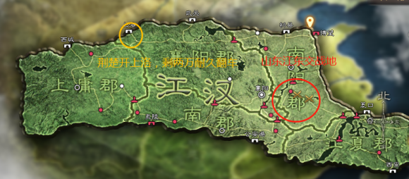 江东孙策由[锋|利刃出鞘]占据,其高战参与保卫江汉的战争,暂时势弱。经协商,后期江东会让出城池给山东曹操、荆楚刘备发展,提升势力。