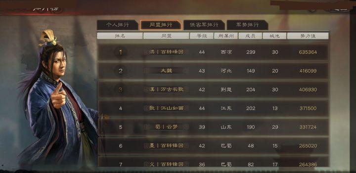 西凉马腾势力的[西凉铁骑]后来居上,离山东曹操仅差70势力值,暂居第三。与河北袁绍联合进入关中后不断发育壮大,目前属于轩辕联军,进军江汉直逼襄阳。