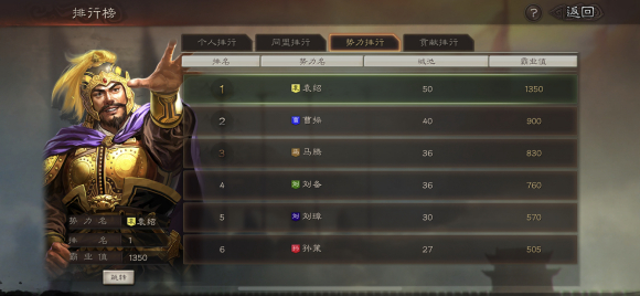 截至6月28日,霸业势力排行榜榜首为河北袁绍。河北袁绍横扫关中、司隶两大资源州,实力不容小视。目前突破丹水直逼襄阳,欲夺江汉之地称霸天下。
