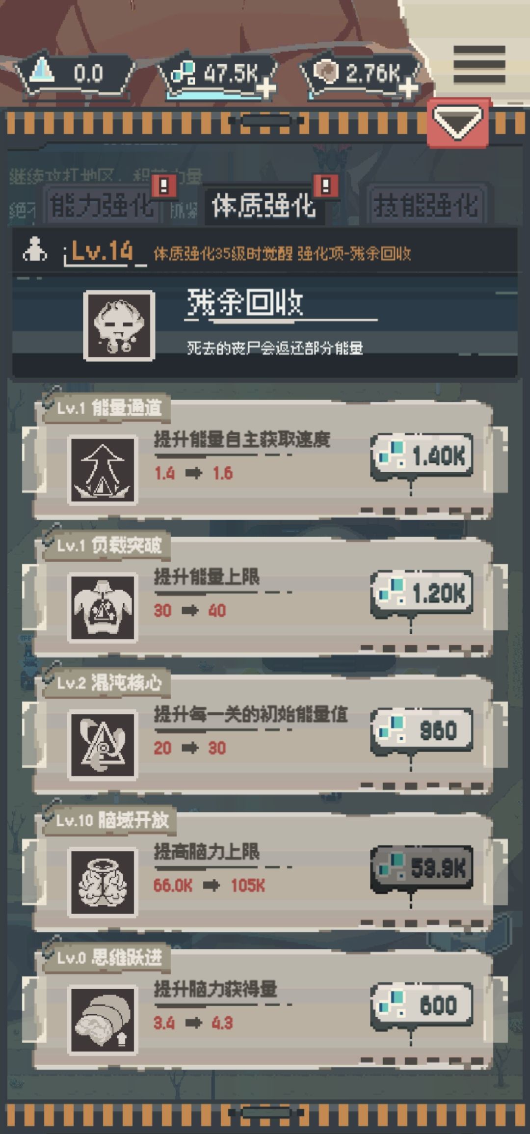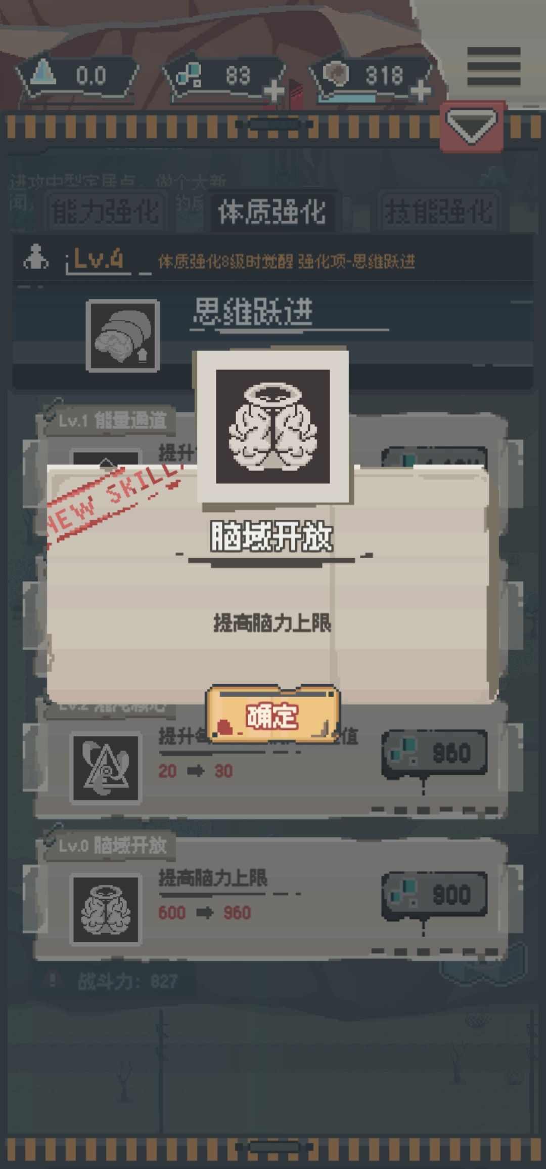 所以我们开局先观看一次血液广告,获得的血液全部升到脑力上限上,再看一次脑力广告,脑力全升到血液上限上,然后重复四次……