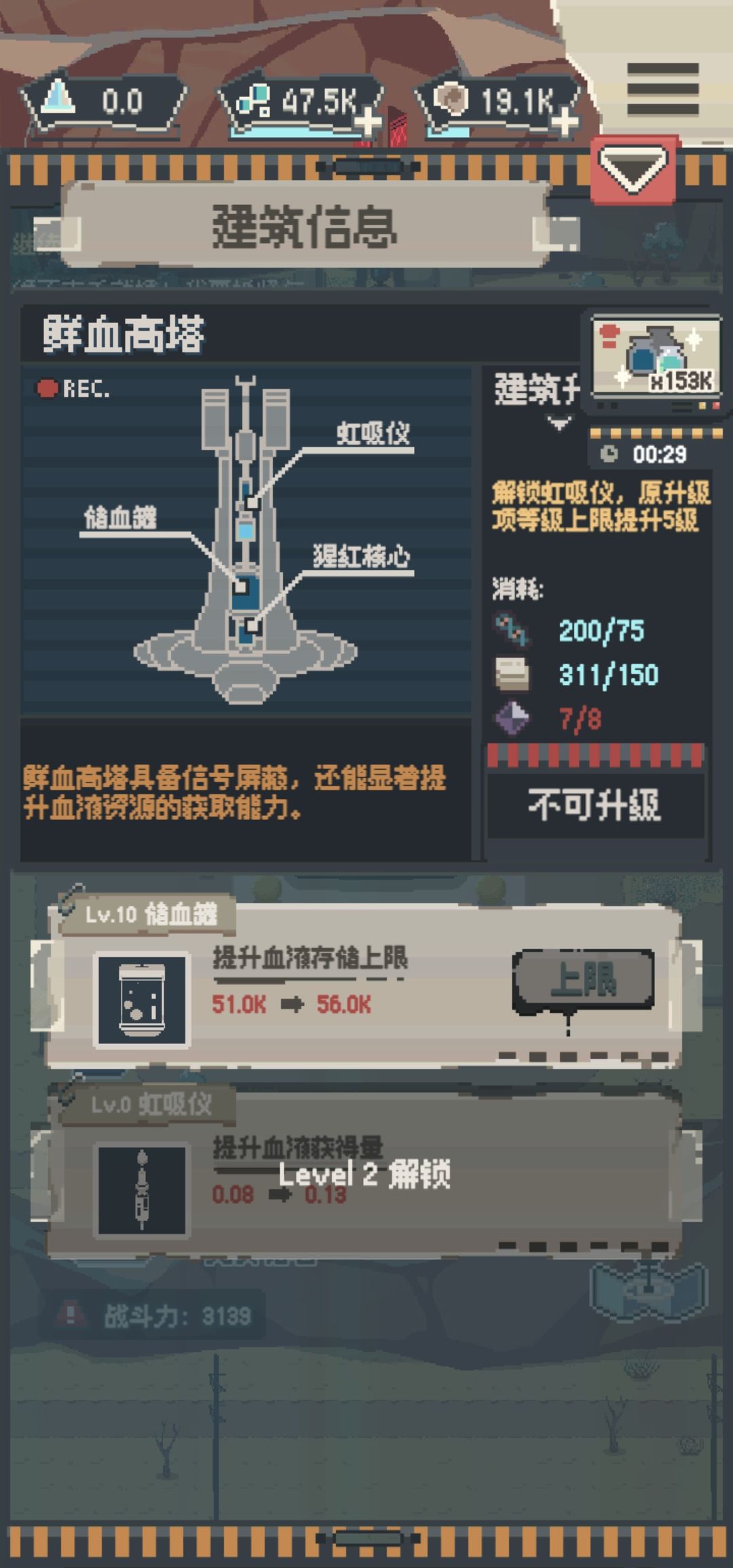中间可能会因为鲜血高塔的等级太低,血液上限等级达到上限,这时候就需要升一下高塔再继续(如果前期几关奖励都看广告翻倍的话,这里是可以直接升级的)。