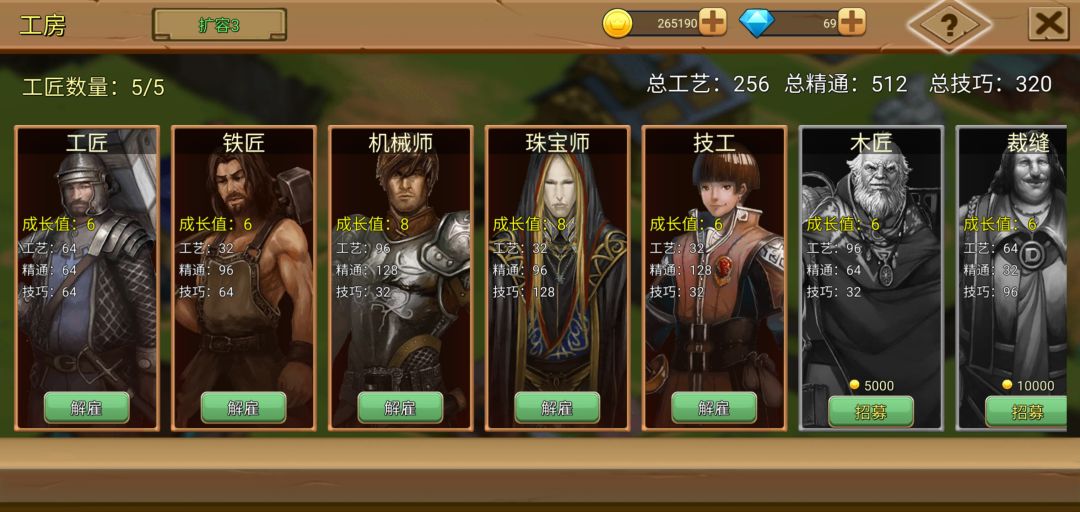 4.工匠。工匠和装备制作,声望任务挂钩。前期资源少,高级装备也很少做,所以只盯着精通就好,努力买到全是124精通的工匠,工艺能高点更好,。等到了制造终极黄装时,才需要算换成124技巧,但那是极其遥远的时候,以这几天的体验来看日常抽箱子和打造装备够用。