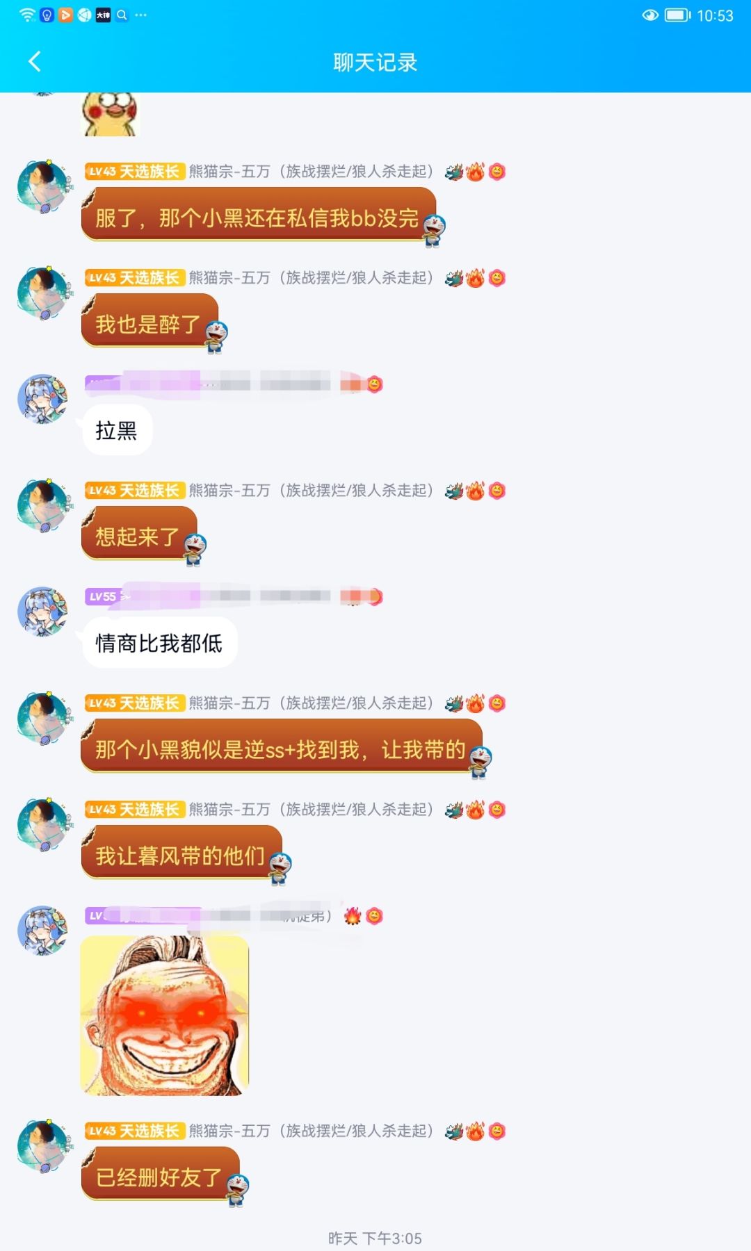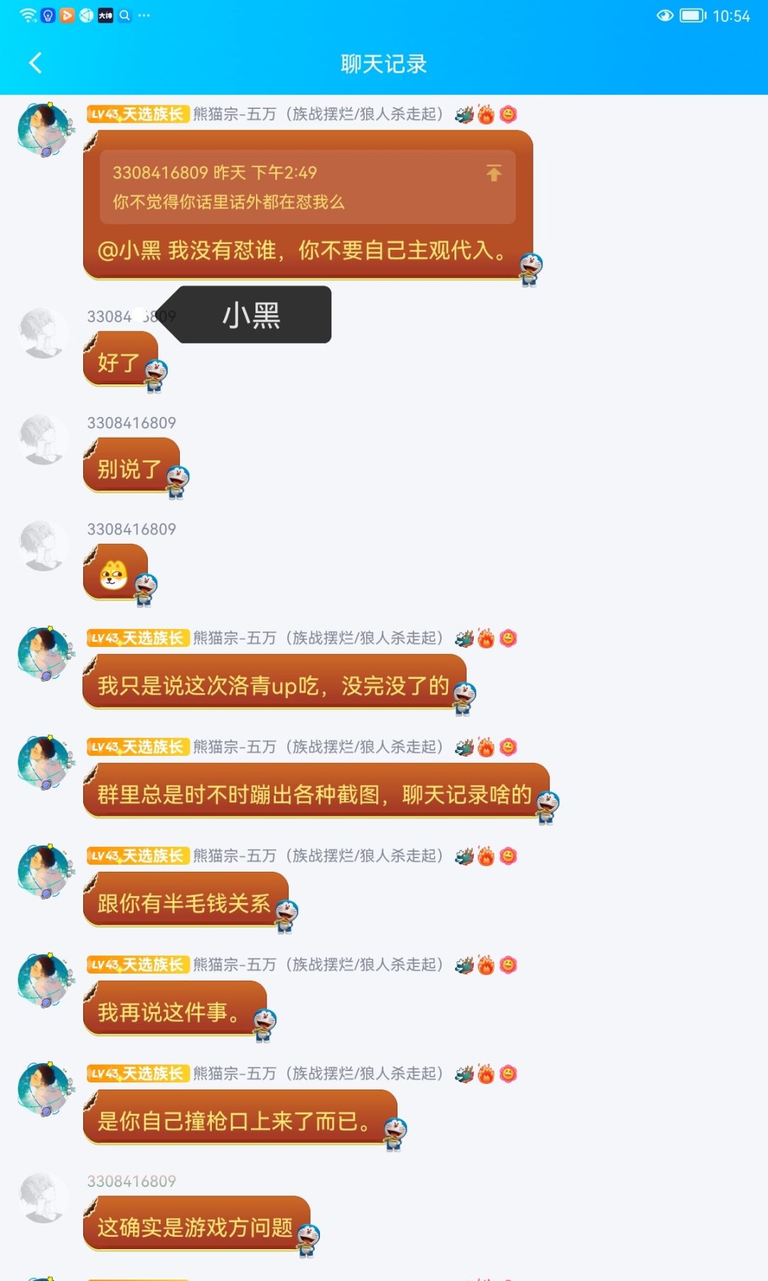 事先声明那个小黑只是来让我们家族带逆ss+的平时也不打深渊家族战。这是当时我们族长跟他的聊天记录,至始至终都是很有礼貌的。我们已经明确说明再说阿闵同志吃瓜过了。你非要带入角色,族长给你道歉了,你还要怎么样。聊天记录都不敢发全?