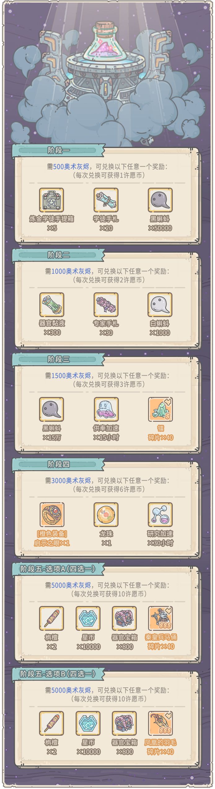 活动期间,贩售机将出现福利礼包,每天5点刷新,售价1白蝌蚪。内容为:白蝌蚪×20、许愿币×1、奥术灰烬×100