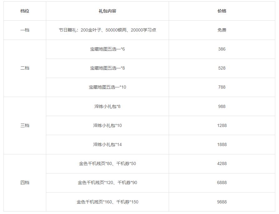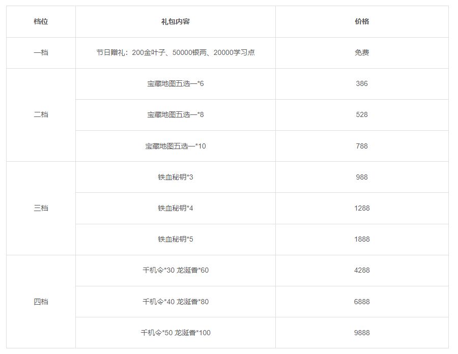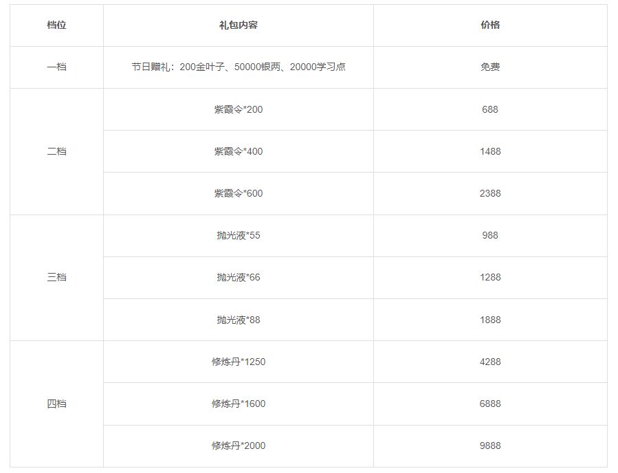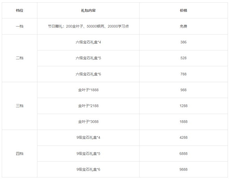 活动一:活动期间将限时上架节日礼包,礼包内容如下: