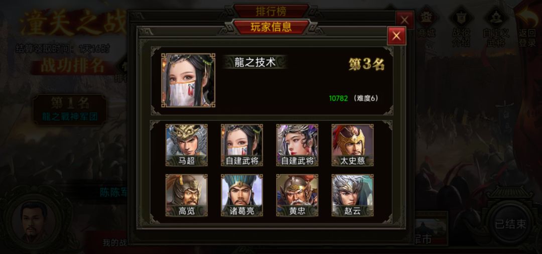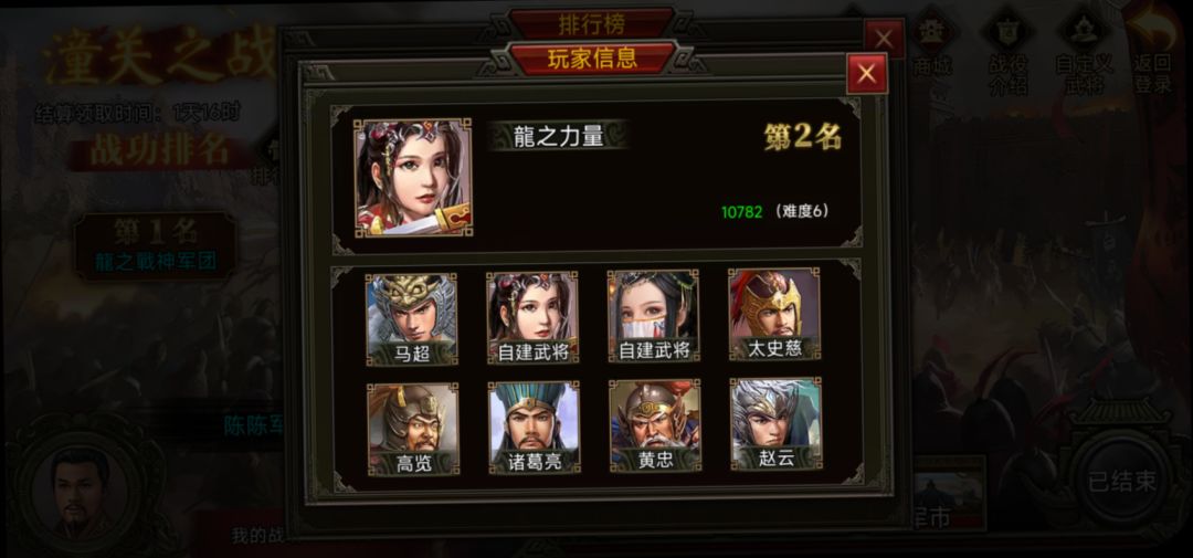 再来看看第3名龍之技术军团。龍之技术军团配备的武将有马超、太史慈、高览、诸葛亮、黄忠、赵云、吕布、马云禄+2个自建。