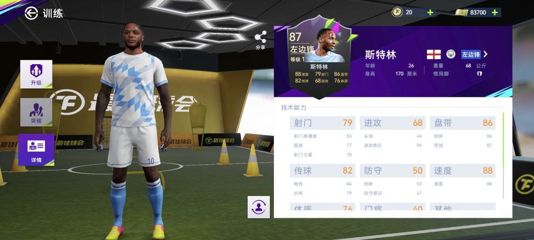 斯特林是一名优秀的边锋,他身体强壮,奔跑速度快,左右脚的技术都非常扎实,在高速运动中的持耐久力高,盘带能力也很优秀。