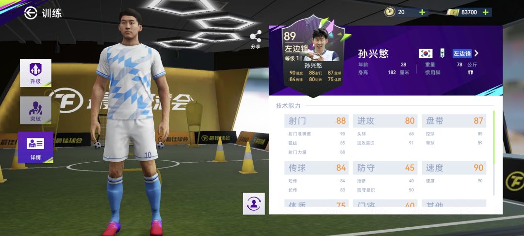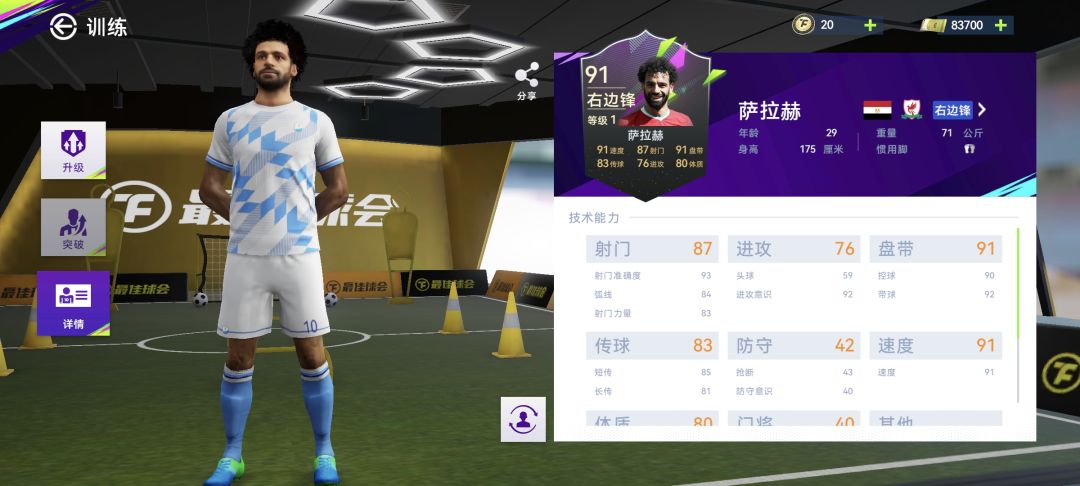 萨拉赫是现役最佳射手之一,奔跑速度可以说在英超中无人能及,游戏中也是达到91的速度值。被称为”埃及梅西“的他,盘带突破能力也很强,有着犹如梅西般的狭小空间内的变向摆脱技术。抽中萨拉赫的主帅们,可以偷偷开心了!
