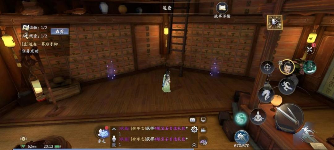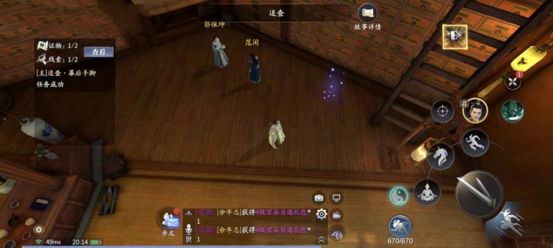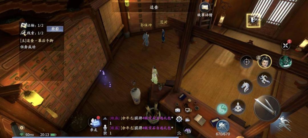 桌后挂画处紫色光点,走近触发支线[进展.密探传讯],开锁环节后与郭保坤对话,离开油铺来到盛府,偷听对话,获得线索【货源问题】。跟踪神秘人来到酒楼,窃听对话后自动获得线索【陈千户】、证物【司国隶】。