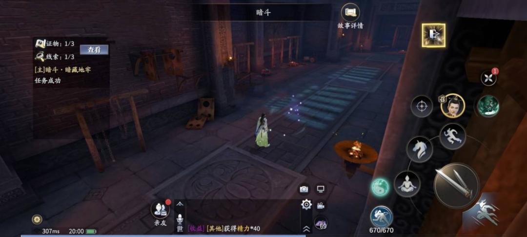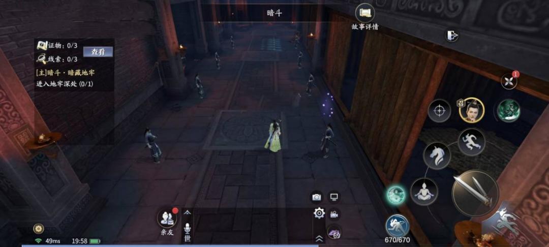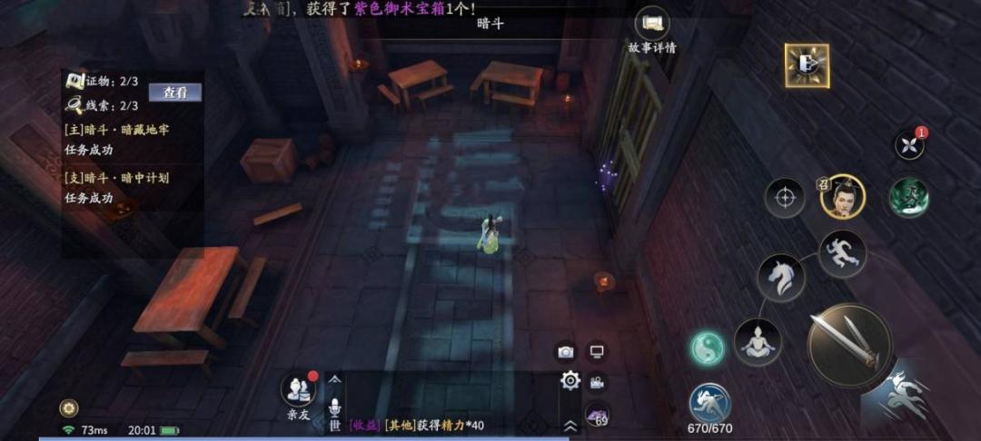 开门后进入地牢深处,走近紫色光点,触发支线[暗斗.深入探查],跟随记号调查思考,获得线索【神秘剑客】,查看桌子后获得证物【人质】,完成小节。