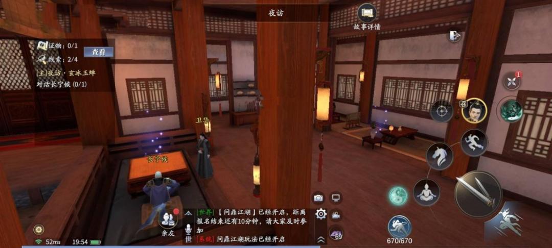 客厅中,查看卫华侧后方的紫色光点,获得线索【棋谱】。长宁侯与卫华身前一段距离设有小几,旁边有紫色光点,走过去后自动触发,获得新线索【卫华】。
