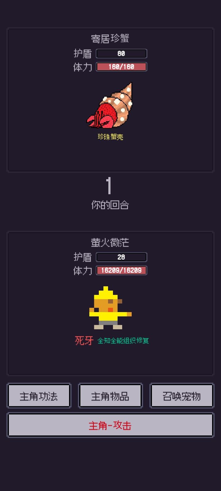 ④战斗操作:战斗时点击“攻击”是普通攻击,选择“主角功法”可使用技能,选择“主角物品”可使用道具。