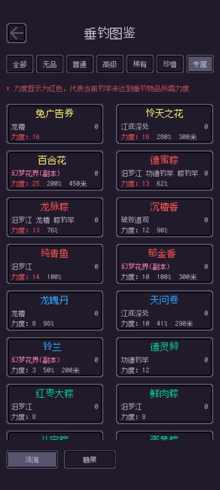 ※注意,只要垂钓时收钩位置达到或超过限制的深度要求,就能概率获得已经满足所有限制要求的所有物品中的一个,深度越深,获得高品质物品的概率越高,当然收钩需要等待的时间越长,所以要合理设置最大深度(目前建议使用最大深度为300的钓竿)。