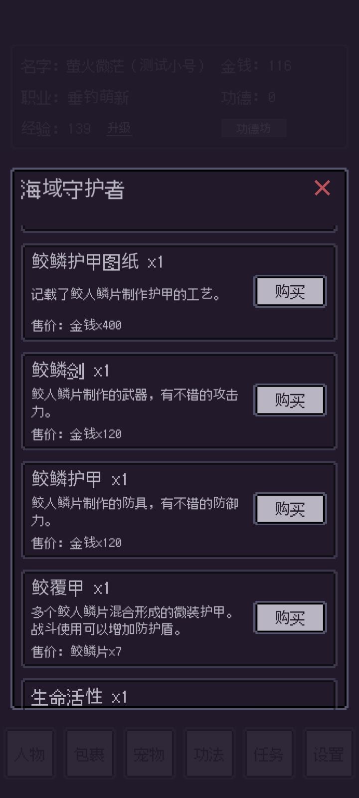 海域守护者售卖“鲛鳞剑图纸”、“鲛鳞护甲图纸”、“鲛鳞剑”、“鲛鳞护甲”、“鲛覆甲”、“生命活性”