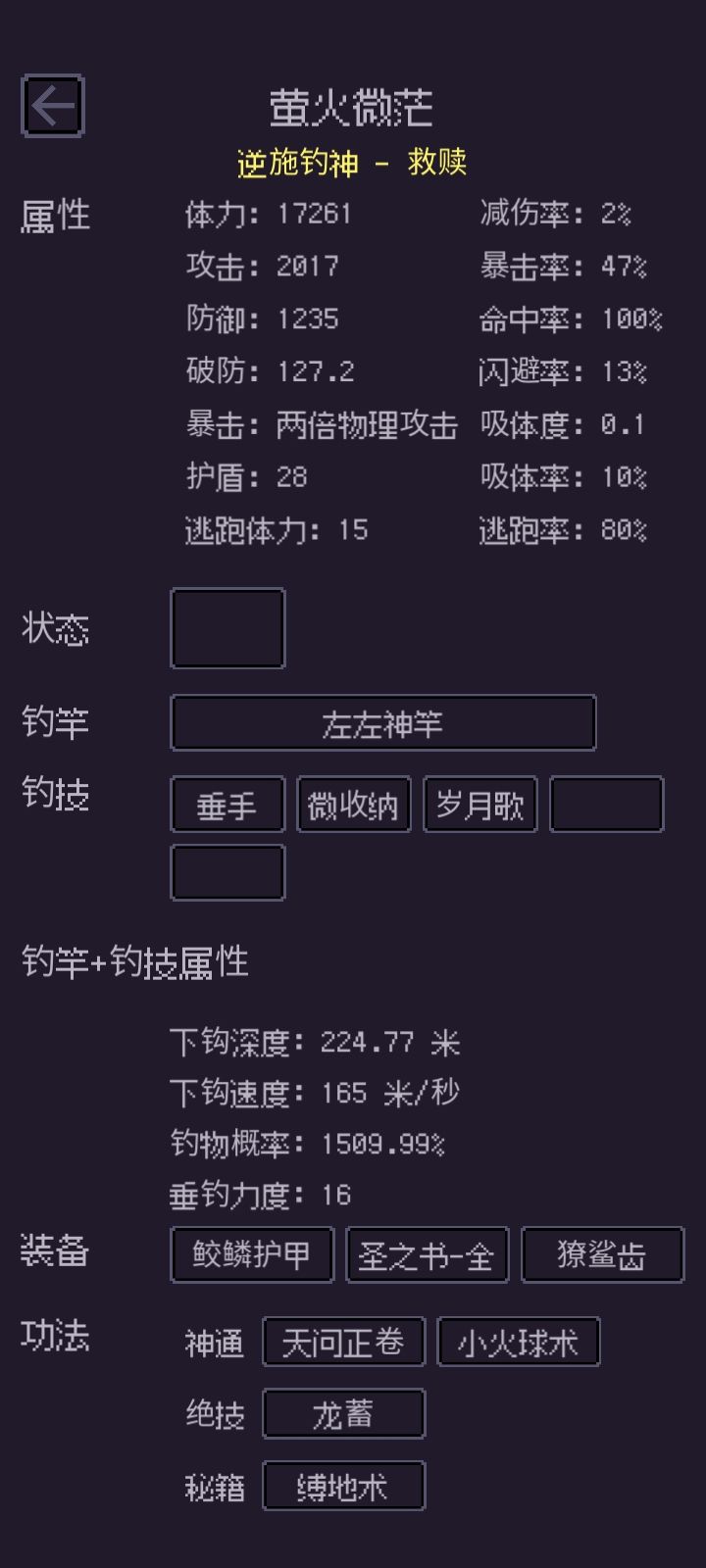③鱼竿:钓竿是垂钓的根本,钓竿有“速度”,“最大深度”,“钓物概率”,“垂钓力度”四个属性,词缀(词缀数量:黄品无,玄品1,地品2,天品3,圣品4),部分钓竿有特殊技能,钓竿能自己重命名。