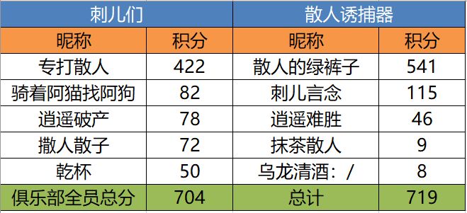 把两个俱乐部目前的积分情况放在一起,是不是有种两军对垒的感觉?只不过“散人诱捕器”这边像是刘关张三兄弟领着一众官兵,而“刺儿们”则像是山东呼保义带着手下一百单八将,双方战的那是一个不亦乐乎。不过巡回赛之外,大家都是散人粉丝,也希望每一位玩家都能够享受在俱乐部中和拥有共同爱好的朋友们一起游戏的快乐呀! 接下来奉上到目前(福州站周预赛)为止,全国俱乐部巡回赛总积分的排名情况吧~
