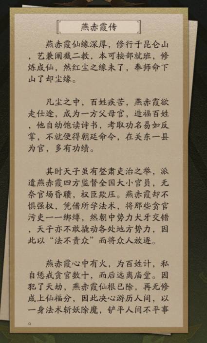 众所周知燕赤霞是蒲松龄先生《聊斋志异之聂小倩》中创作的人物,在神仙道3游戏中当收集完任务的传闻后就可以看到人物的传记。