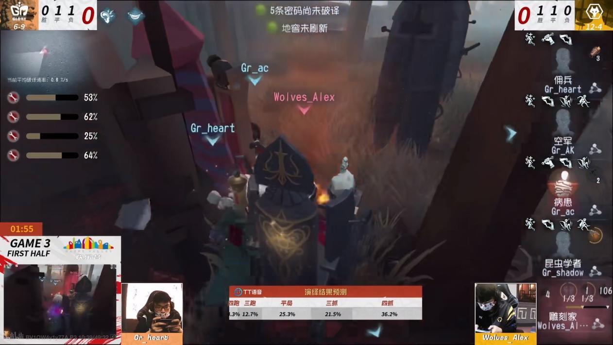 Gr vs Wolves第三局上半局Wolves_Alex雕刻家灵性卡位,四抓提前终结比赛:开局 Gr_AK的空军被追击,选择极限距离交枪,Wolves_Alex的雕刻家选择换追病患,两个精准雕像迅速将其夹为残状态,后闪现击倒,挂在大门。Wolves_Alex首先用雕像封住窄路,再出刀,本体卡位逼迫佣兵绕路,再次博弈出刀,逼迫佣兵松手过半秒救。再次追击病患,骗红光拉近身位,病患没有机会交钩被击倒。同时雕刻家开出二阶技能,炸残昆虫学者,淘汰病患后无缝衔接追击节奏,击倒昆虫学者将其挂在遗产机,底牌切失常终结求生者希望。Gr_AK的空军利用窗弹快速贴近狂欢之椅,走位灵活躲避雕像,救人博弈骗雕刻家打椅子,昆虫学者被救下进行二次牵制。Wolves_Alex选择回身追击补电机的空军,牵往电机处放下,又平地追倒抢电机的昆虫学者,双人倒地,再次失常,拿下四抓。