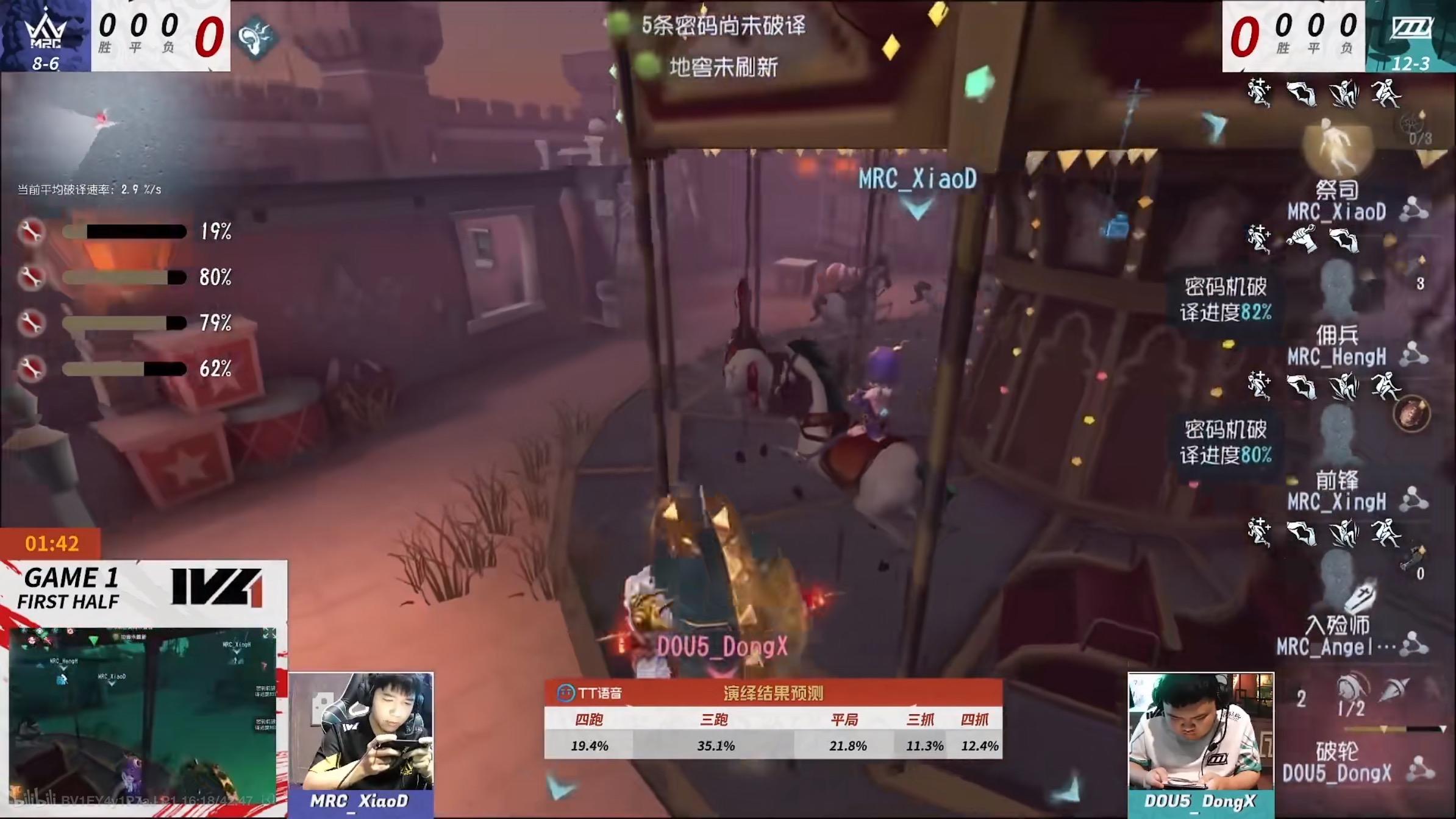 第二天,MRC vs DOU5 第一局上半局,MRC求生者玩转过山车和旋转木马,四出DOU5_DongX:开局MRC_XiaoD的祭司被破轮快速找到,MRC_XiaoD选择吃刺后打洞坐过山车来到二站;破轮切换人形态后,祭司下车利用窗弹和通道逼迫破轮再次切形态,祭司再次上车来到河对面,吃刀后上旋转木马,在破轮切形态的时候秒下木马翻窗,逼迫破轮交出闪现。MRC_HengH的佣兵同样利用旋转木马卡血线,MRC_XingH的前锋及时到位进行ob,交过技能的破轮毫无反制手段,MRC_XiaoD的祭司自起后再次上木马,破轮换挂前锋,利用高机动性将佣兵击倒在遗产机,又击倒入殓师,试图消耗求生者道具。但求生者选择让MRC_XingH的前锋撞救省棺材,MRC_XiaoD祭司利用大洞补电机,MRC_XingH的前锋持续进行干扰。开门战破轮面对有棺材的MRC_AngelDD的入殓师,击倒后虽然在地窖口将其拦截但戏谑仍在冷却中,入殓师走地窖四出。