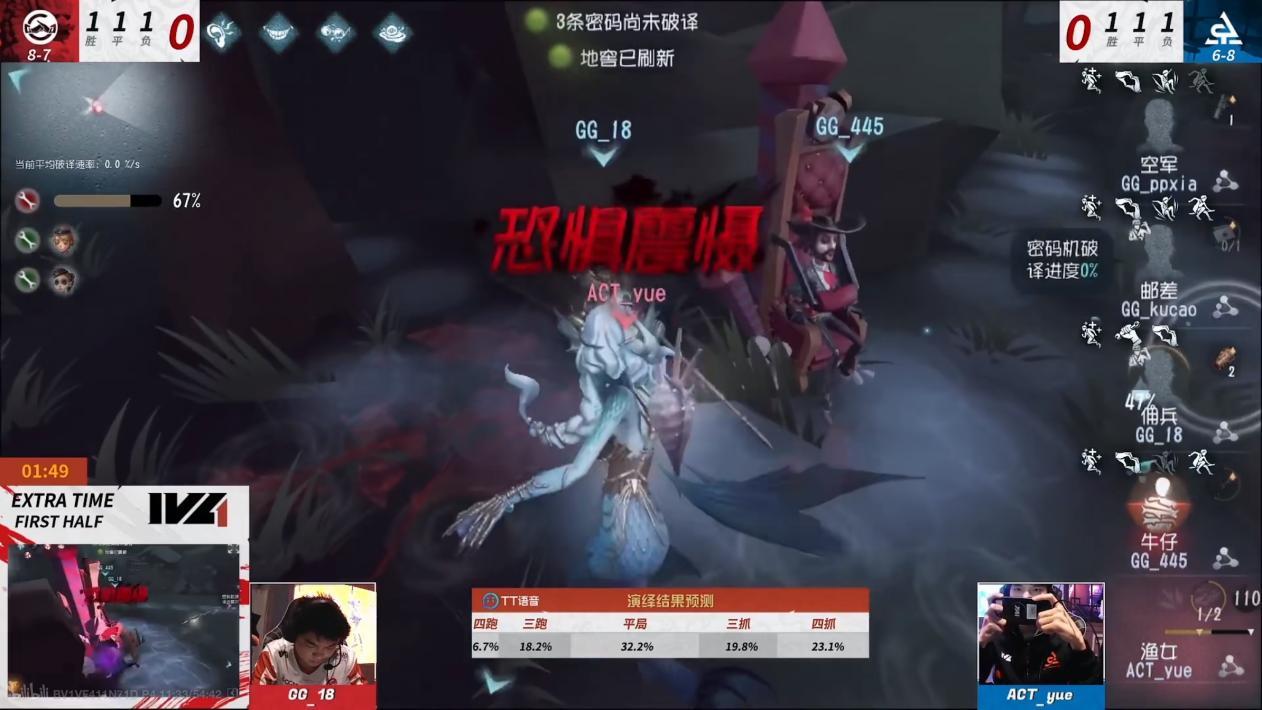 成都GG vs ACT加时赛上半局,ACT_yue渔女四抓,压迫感拉满:ACT_yue的渔女开局追击具备强拉点能力的牛仔,ACT_yue丢叉圈住双十一,将牛仔逼往空地给刀,在大门果敢闪现将其击倒。ACT_yue预判佣兵救人直接出刀,恐惧震慑拿下双倒。空军虽前来开枪支援,ACT_yue再次圈住双十一,极限水汽爆倒牛仔。后ACT_yue在小船击倒没有自愈的佣兵,果断底牌切传送,守住大船上最后一台电机,驱赶两名求生者,并将邮差击倒在大船,机人同守。ACT_yue选择先将前来抢电机的空军打残,佣兵前来救人,锁定三人位置且全员残状态,手中有传送,求生者道具被逼完,修机被传送击倒,ACT_yue拿下四抓,锁定胜局。