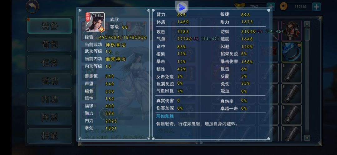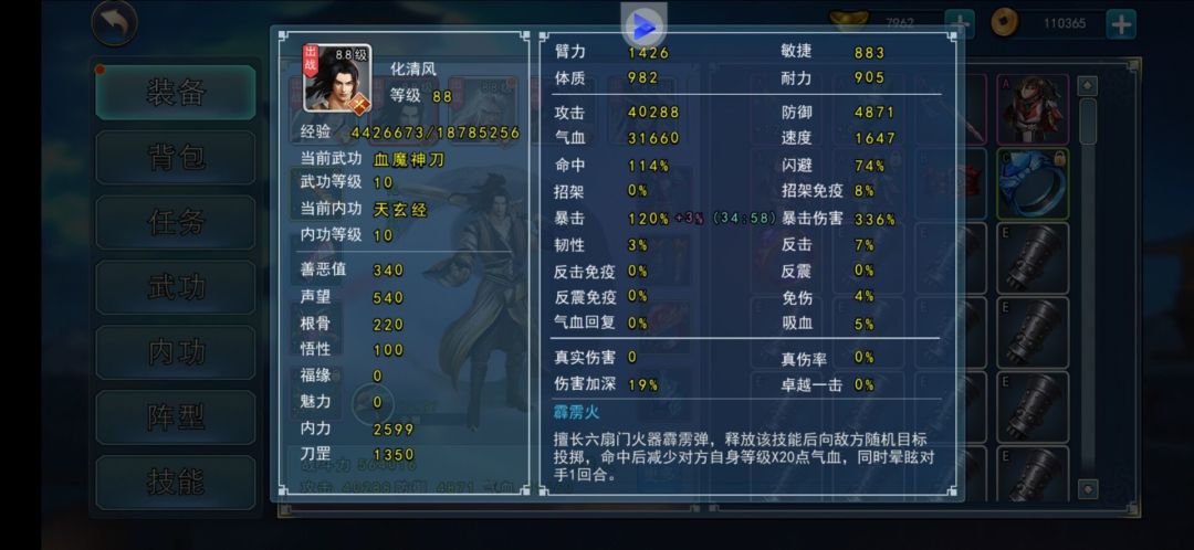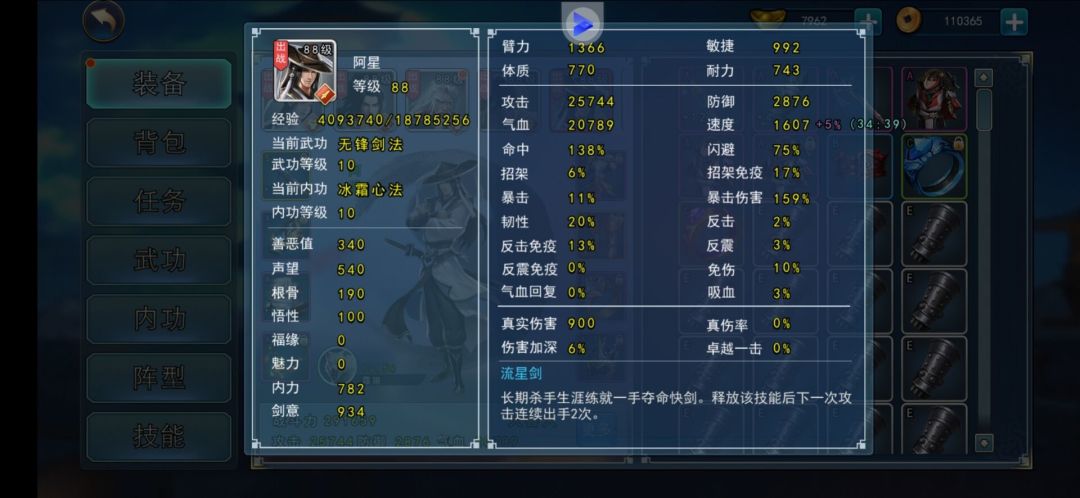 刀的这个属性差不多,黑衣人的韧性不是特别高,120的时候基本上可以稳定暴击了,需要注意的是主拳要有点闪避,大概120左右就行。剑的话有一把减防剑就好,最后一层洗减防几率,速度要比刀快。副拳就带晕拳就行。