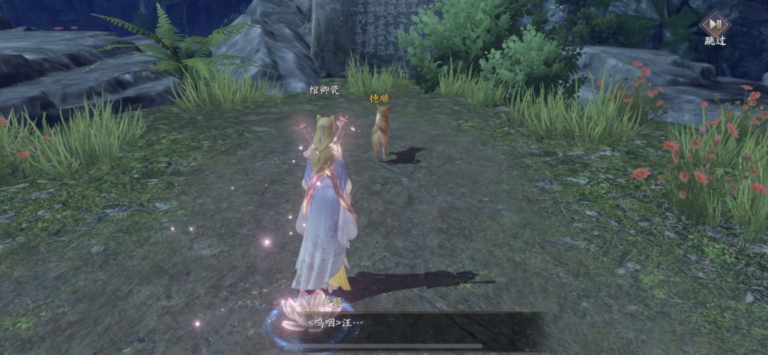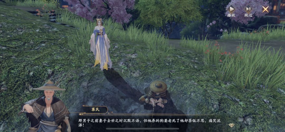 (2)在达成【采集白芍20次】的条件后,前往古黎寨集市坐标【386,420】看到了那位哭泣的男子。寨民说,此人颇为奇怪,以前妻子逝去他沉默不语,现在养的狗要老死了他却茶饭不思。此时男子的狗突然跑了……