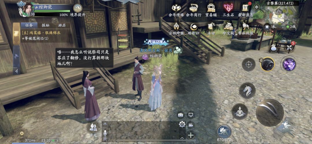 (1)请于【白天】前往古黎寨地图坐标【326,469】的市集,看到屋门前有两个人正在交谈,听闻古黎寨有危房在进行翻修和拆迁。(如果没有看到NPC,可以切线查看,靠近会触发异闻)