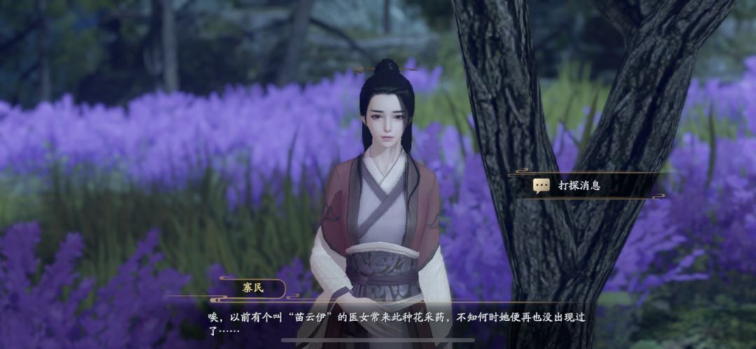 (1)古黎寨附近有男子在哭泣,有人说他经常前往集市北方【328,553】,在与树下的人打探消息得知,从前有一苗族医女时常来此种花采药,不知何时便再没出现过了……
