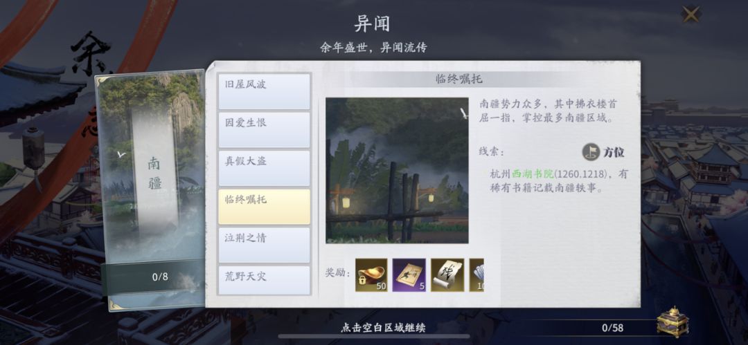 (1)前往杭州西湖书院坐标【1260,1218】找到记载南疆轶事的稀有书籍。