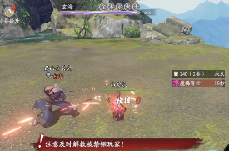 【魔佛降世】在释放后,玄海会随机点名两名玩家禁锢无法移动且持续受到伤害,而这个时候,被禁锢的两名玩家需要其他玩家靠近及时解救。