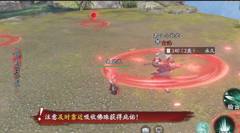 【梵渡九天】如图所示,玄海随机召唤佛珠,一段时间后释放梵渡九天造成大范围高额伤害,靠近佛珠能被吸收并免疫梵渡九天伤害,同一佛珠只能被吸收一次。