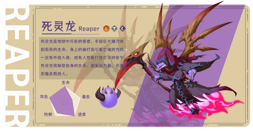 二技能【死神镰刀】,对敌方造成暗属性伤害的单体攻击,并吸取血量;