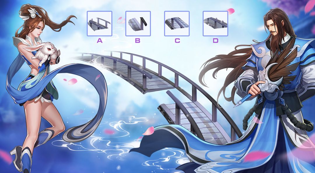 鹊桥的一头,月英正等候诸葛郎君前来赴约。可惜桥身突然断裂,几位工匠赶工修复残缺桥身...一旁有4个不同的残缺桥身的拼图,只有一块可以完美拼接使桥身完整。请找出那一块!