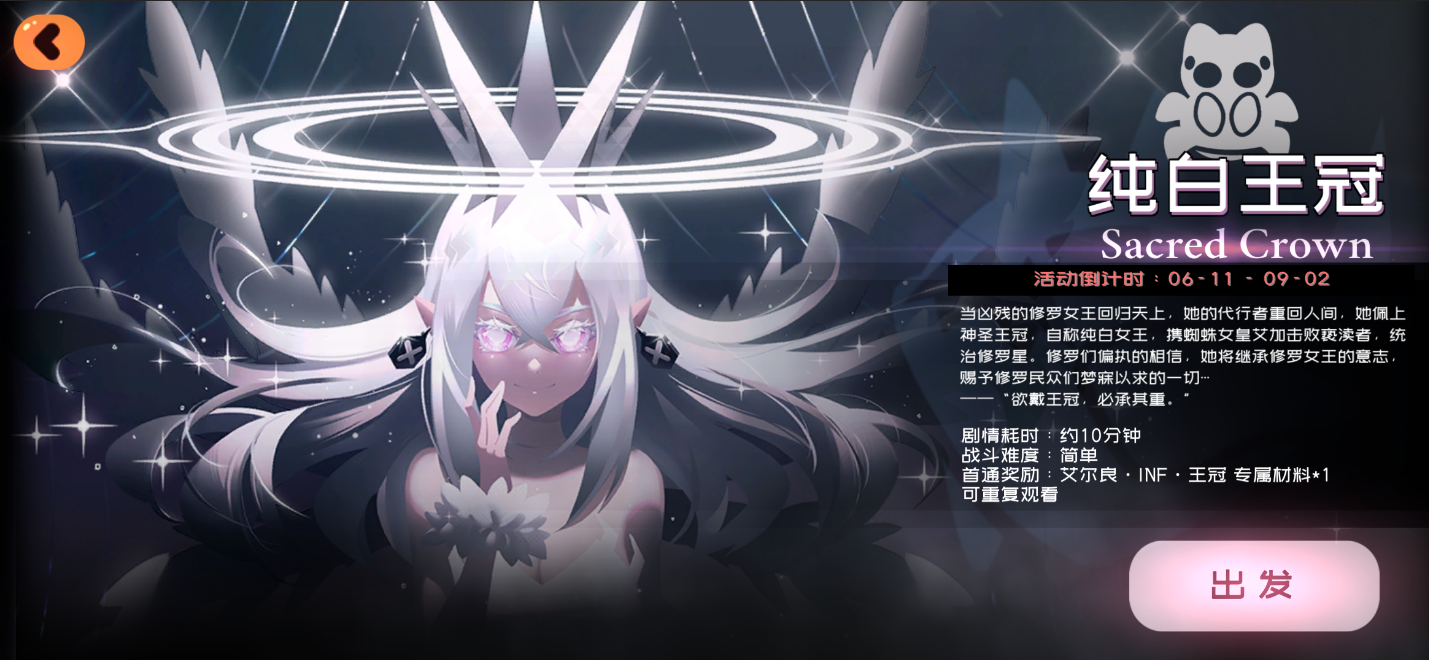 剧情耗时时间约为10分钟,战斗难度为简单,首次通关可以获得艾尔良·INF·王冠的专属材料*1,可以重复观看。