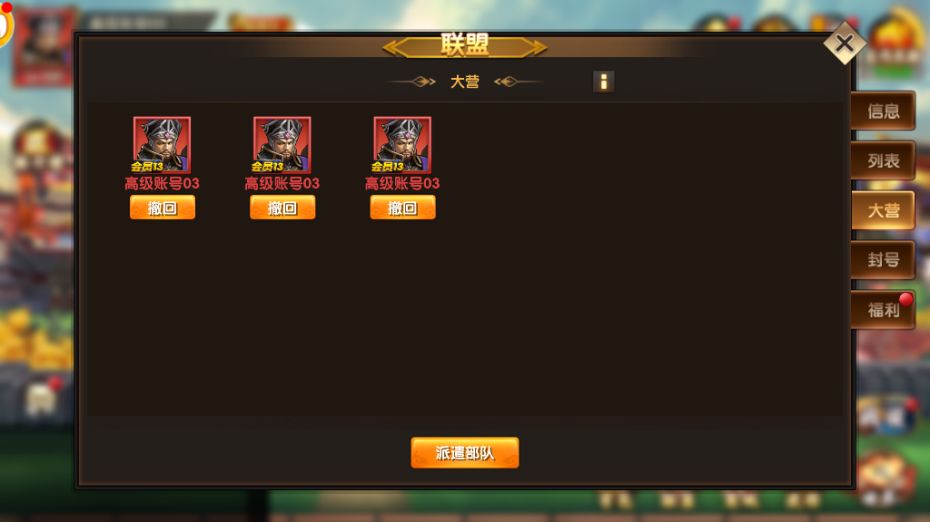 ③大营:联盟内成员可以将部队派遣到联盟大营中,联盟长及副团长可以在城战时调遣大营中的部队自动参战