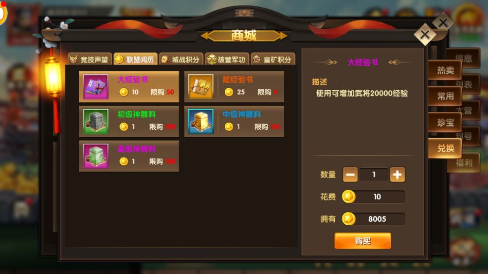 ⑦联盟商店:消耗联盟阅历兑换商品,联盟阅历城战获取,可兑换大经验书、超经验书、初、中、高级神器料 5种商品