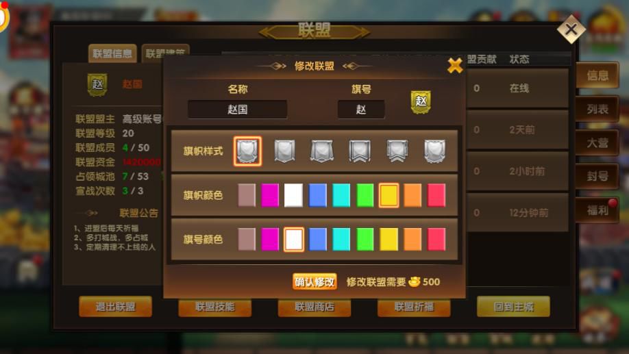 ④联盟长在联盟内务中可进行联盟升级、群发邮件、联盟改名及修改军旗等操作