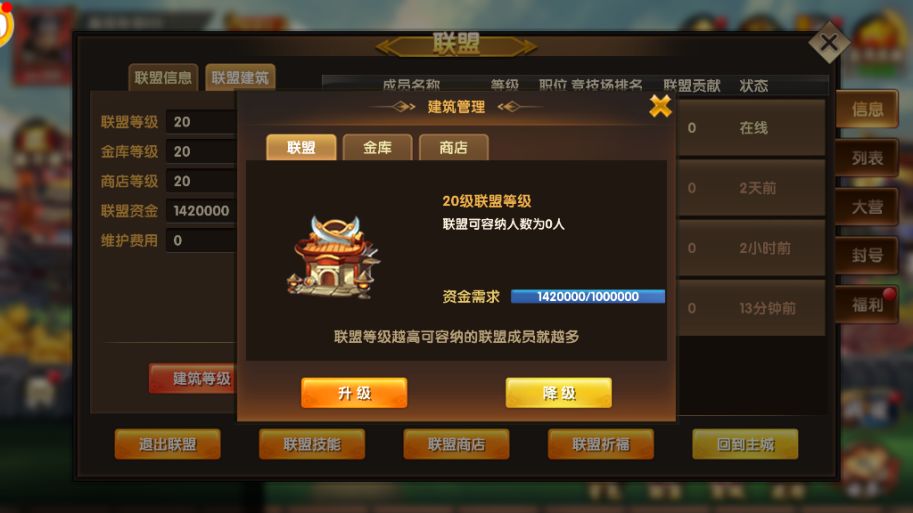 联盟建筑有3种,可通过联盟资金升级,盟主有权限操作